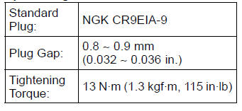 The standard spark plug is shown in the table. The spark plugs should be replaced in accordance with the Periodic Maintenance Chart.